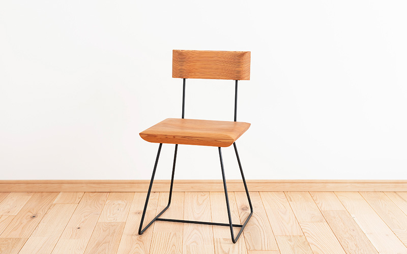 45mm厚の天板は縁の角度加工で軽やかに見せ、職人によるカンナ仕上げで表面は滑らかです。脚部には直径10mmの丸棒鉄を使用し、背もたれ部分の鉄はしなりを持たせ体にフィットする座り心地を実現しました。