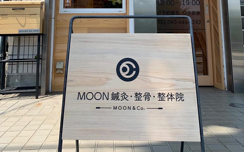 東京都調布市にあるMOON鍼灸・整骨・整体院様では、開業にあわせて、百年木材が製作を手がけた木製看板が設置されました。