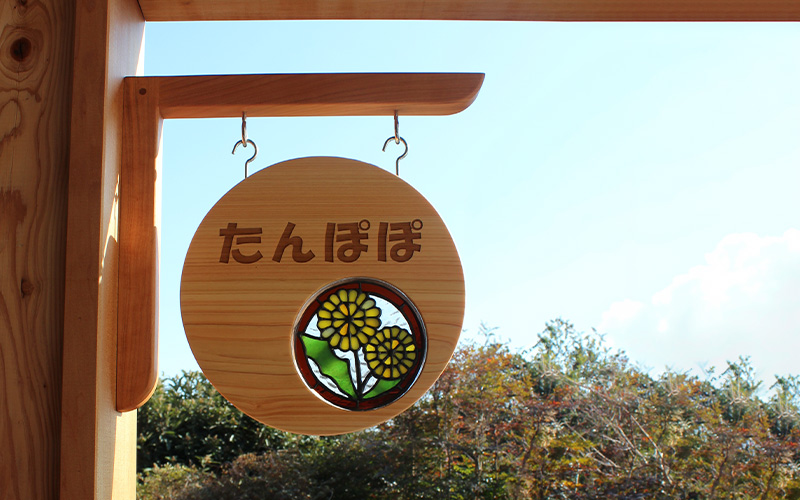 吊り下げ式の木製看板は、軒先や廊下に設置することで、空間全体に統一感をもたらします。子どもたちの成長を見守る場にふさわしい、自然素材の優しさが表現された事例です。