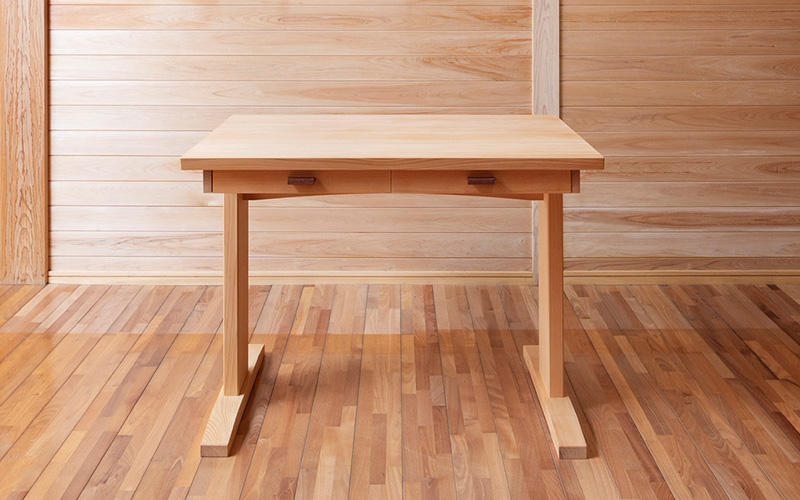檜は耐久性や耐湿性に優れ、湿度の変化がある環境でも状態が安定しやすい木材です。反りや狂いが出にくいため、日常的に使う机の素材として安心感があります。