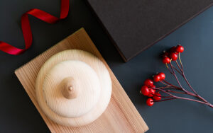 「百年木材」の創立記念品として代表的なアイテムが、樹齢100年以上の国産ヒノキを使用した木製の「鏡餅」です。縁起物としての意味を持ちつつ、木の温かみと香りが楽しめるインテリアアイテムとして人気を集めています。